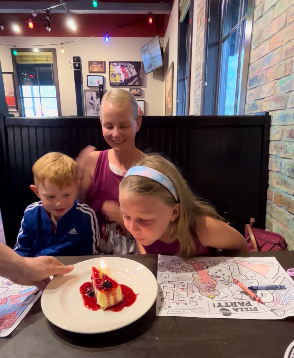 We didn’t get any pictures of that breakfast that morning, but we did get some pictures and video of dinner that night. Sandwiched between my kids, smiles big and eyes bright, wearing a matching dress with my daughter, port bandage popping out of my dress and very little hair to show, singing and laughter, stolen worried glances with my husband – it was a perfect example of how brutal and beautiful life can be all at the same time.